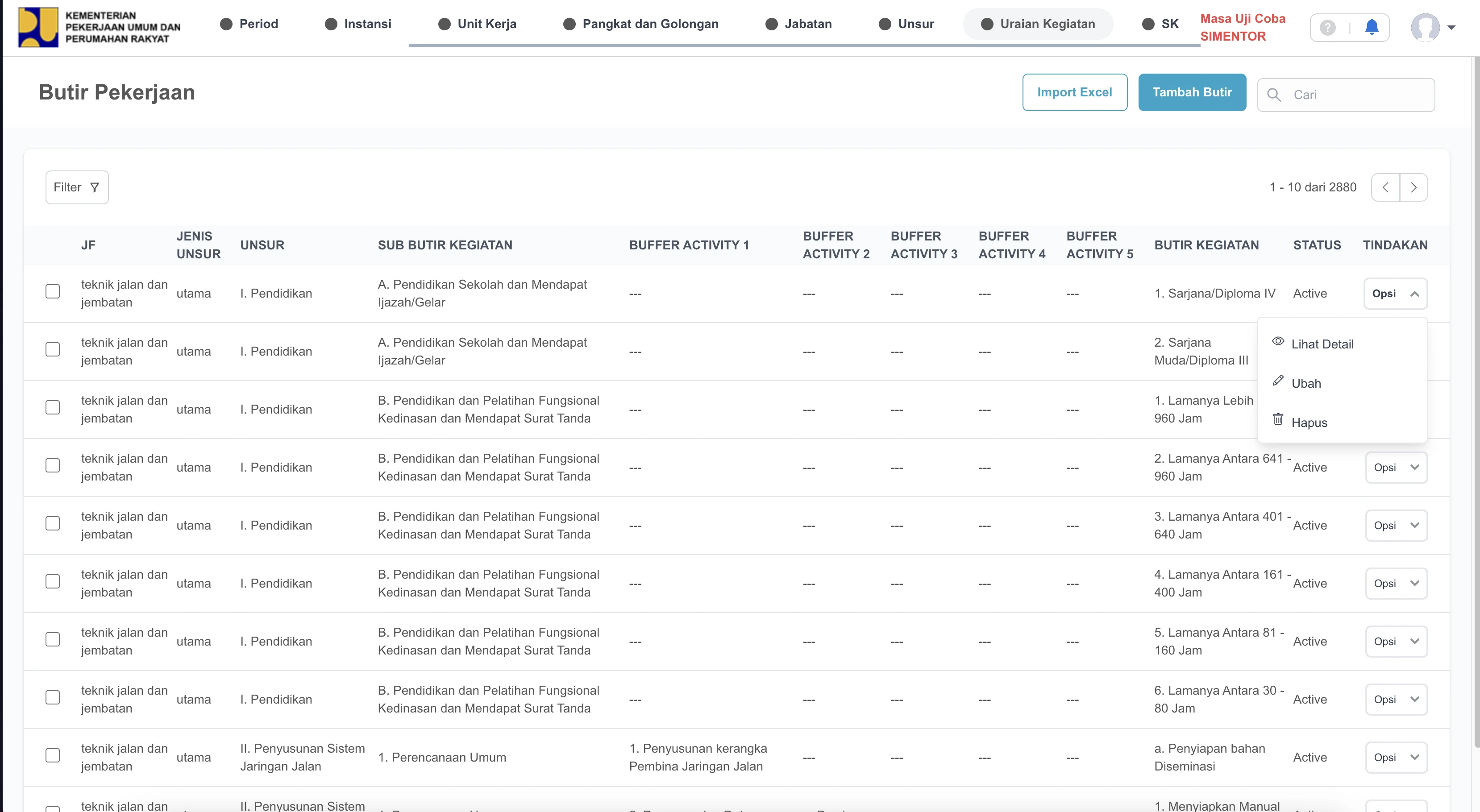 Organized modules where employees log specific work activities (Uraian Kegiatan) tied to specific evaluation periods.