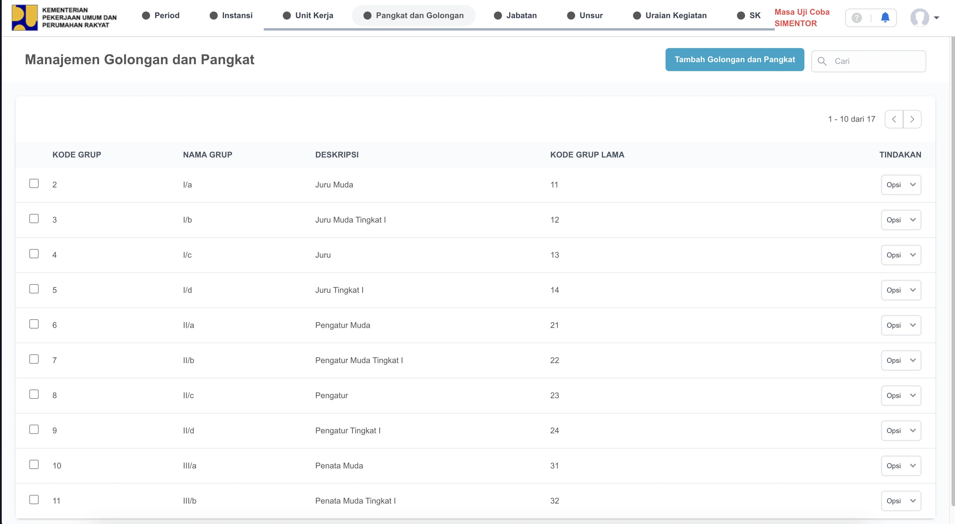 Detailed CMS tools covering departments (Instansi), work units (Unit Kerja), ranks (Pangkat), and job titles (Jabatan).